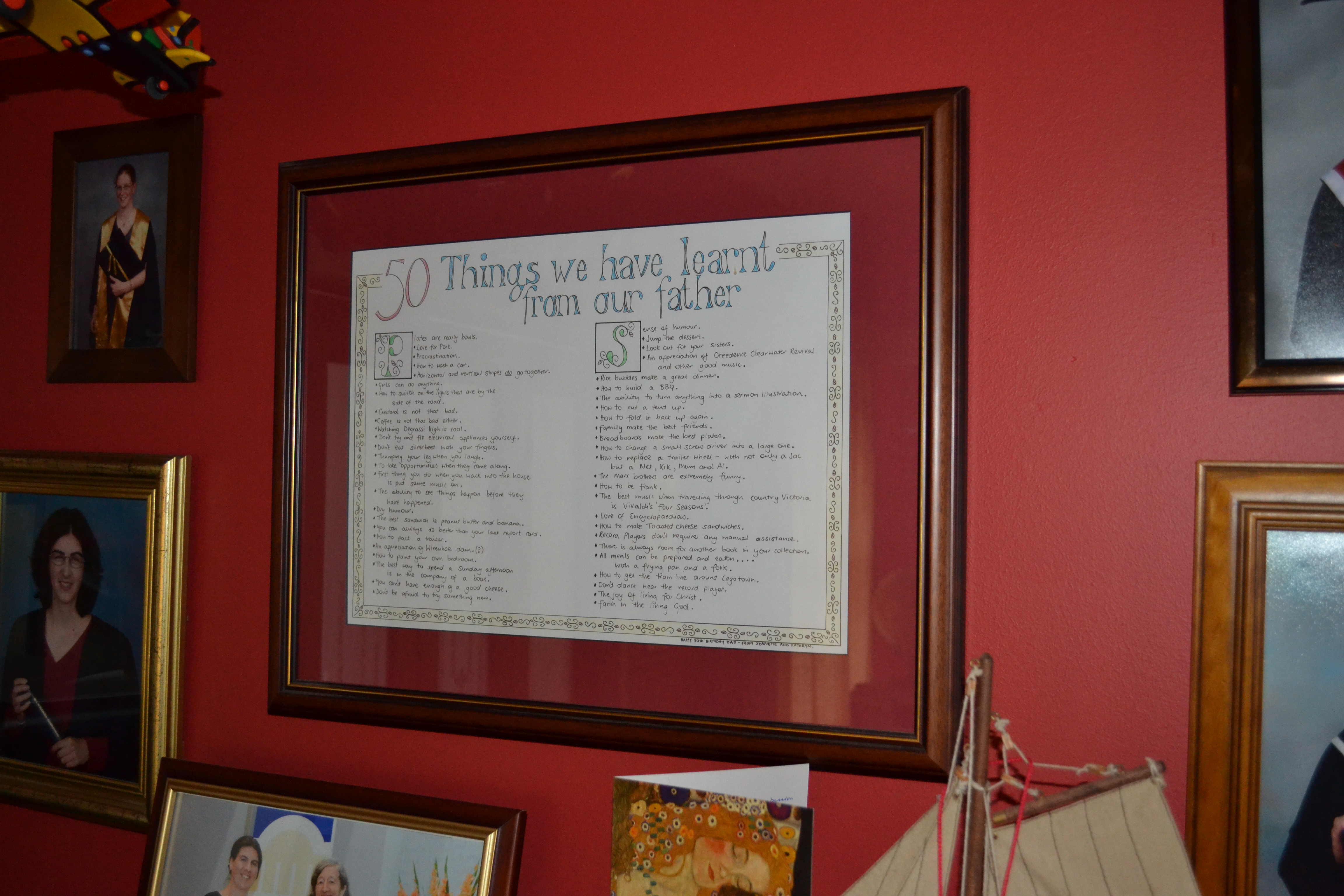 One of my favourite possessions is a framed poster made by two of my daughters when I turned 50 … that is, a long time ago. This poster has hung in my study ever since. They called it, “50 Things We Learnt From Our Father.” It contains a whole range of ideas from the humorous to the serious. Some of the lessons came from their own experience and some are dated. An example, “Don’t dance near the record player.”