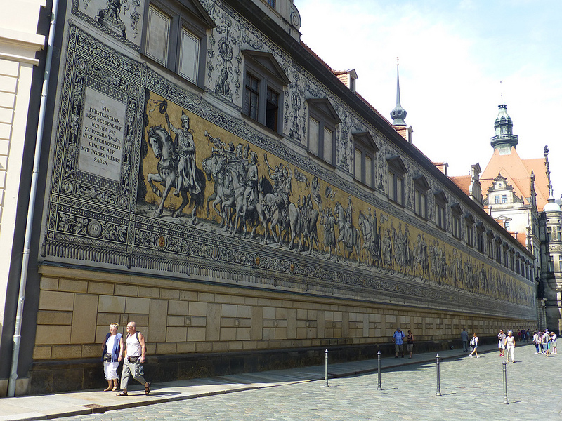 The Fürstenzug, a 100 metre C19th mural celebrating its medieval nobleman only received minor damage and was still a spectacular cavalcade.