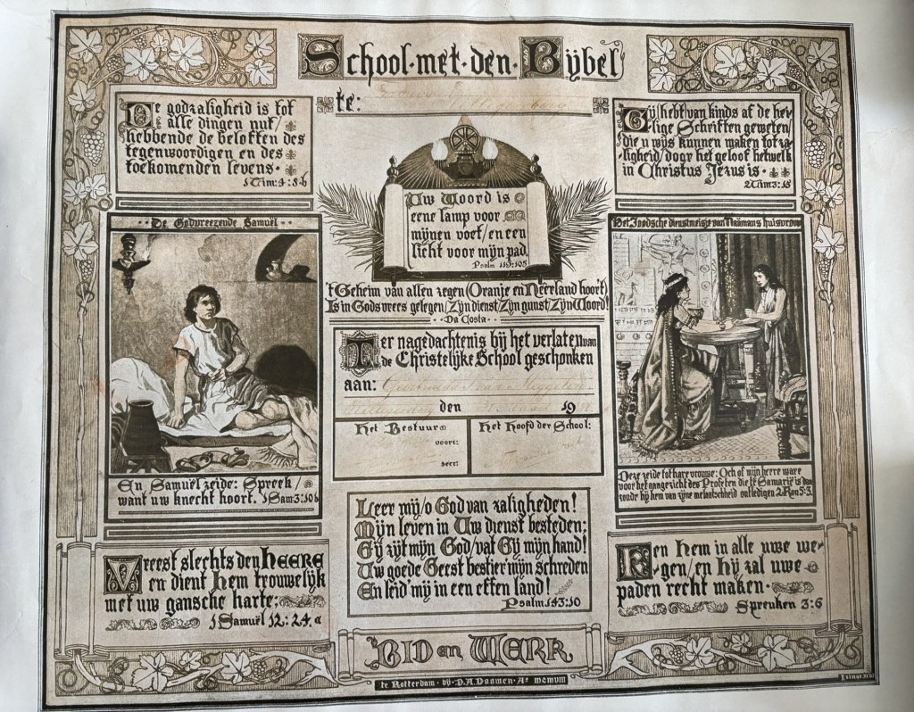 So, this is how these 80 to 90 year old treasures came back to the family. There was a wedding photo of my grandparents which included many other family members, letters from a nephew who was in a Spitfire squadron in Indonesia during the uprising in the late 1940s, pension slips, post cards, school books, books that had been presented by church and school to my aunts and uncles, and my favourite, a certificate belonging to my mother for completing her primary education at the “School met den Bijbel”.