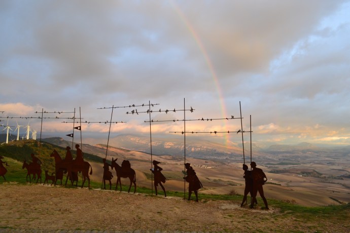 Day 3.We stayed at a very friendly albergue (which I have been spelling incorrectly) in Zariquiegui. Breakfast consisted of a sweet roll, black coffee and orange juice. By 7am we were on the road to Puente La Riena via Alto del Perdon a peak which was quite a steep climb and an even steeper and rockier descent. At the top of the ridge is a line of wind turbines which would have excited Don Quixote.